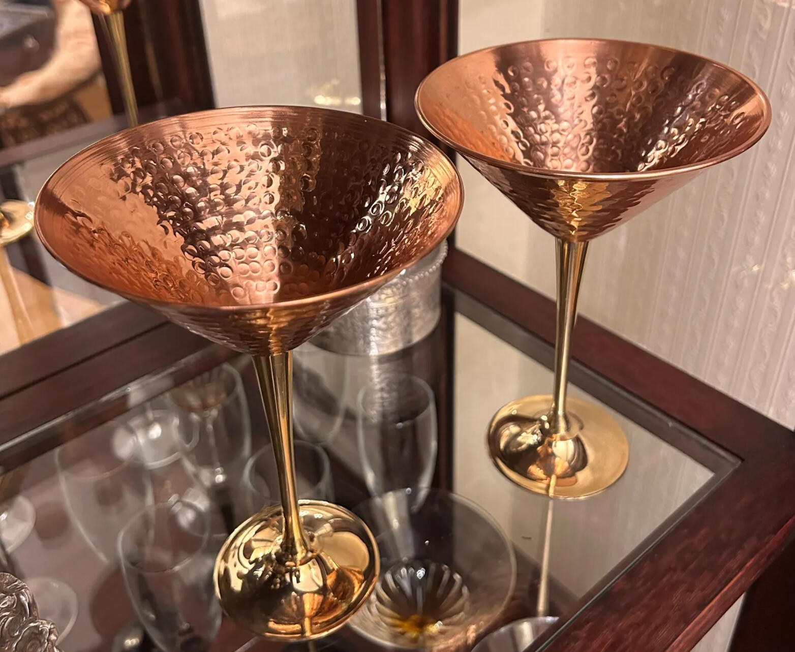 Featuring a beautifully hammered copper bowl and a sleek brass stem, these glasses brings a vintage, artisanal charm to every sip.